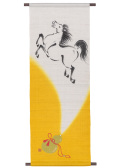 力強い筆さばきで一気に描き上げた、勢いよく跳ね上がる馬。かすれを生かした墨描きの面白さを お楽しみいただけます。ざっくりとした温かみのある綿麻生地も魅力の一つとなっております。