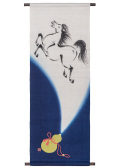 「瓢箪から駒が出る」ということわざをモチーフに、朱と紺の2色展開で仕上げたユーモラスなタペストリー。