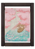 花びらが川面に連なり流れていく花筏と十石舟(じっこくぶね)。散ってもなお美しい晩春の桜を楽しむ、日本ならではの景色を描きました。